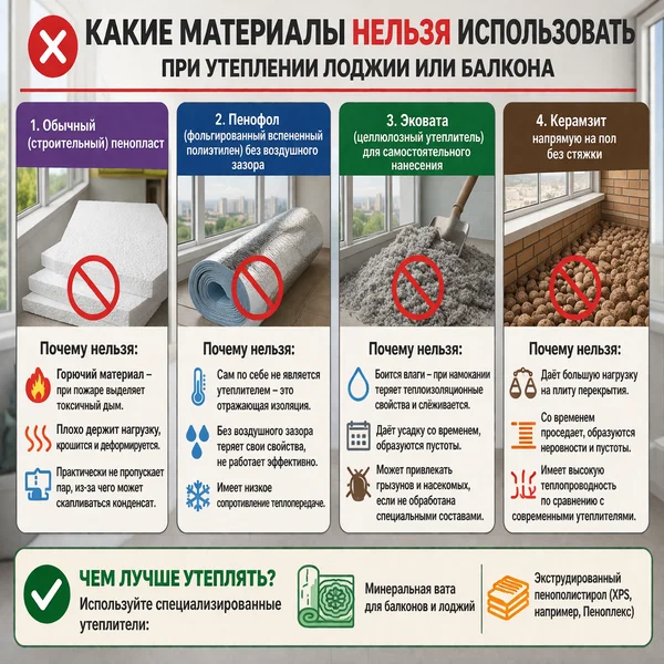 | Материал или решение | Почему нельзя/нежелательно | Риски и последствия | Допустимая замена при утеплении балконов |